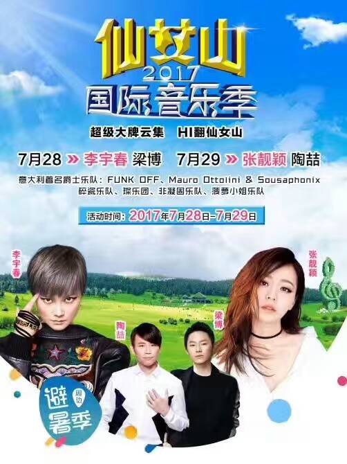 2017仙女山国际音乐季即将火爆开启,作为西南地区最具影响力的音乐盛事,今年音乐季依然是大咖云集。有实力与颜值兼具的超人气偶像——李宇春、华语R&B音乐教父——陶喆、最具国际范儿的“海豚公主”——张靓颖、新生代原创摇滚音乐人——梁博。他们将携手意大利知名爵士乐队FUNK OFF和MAURO OTTOLINI& SOUSAPHONIX,以及非凝固、璨乐团、碎瓷、菠萝小姐掀起仙女山夏日音乐风暴。